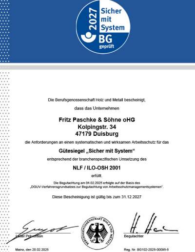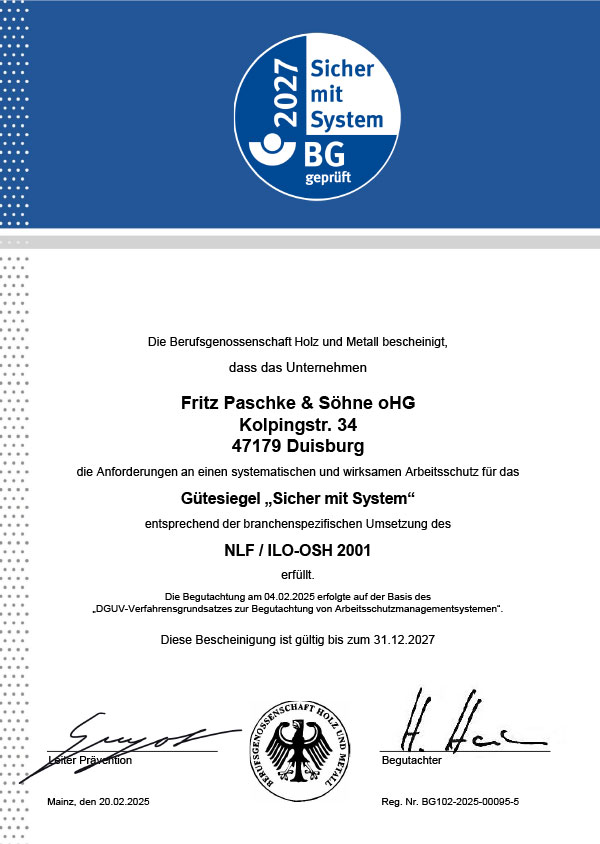 Als Mitglied der BGHM lassen wir unsere Organisation regelmäßig von unabhängiger Stelle auf systematischen Arbeitsschutz hin überprüfen. Für uns ein Muss nach dem Motto „Sicherheit mit System“.